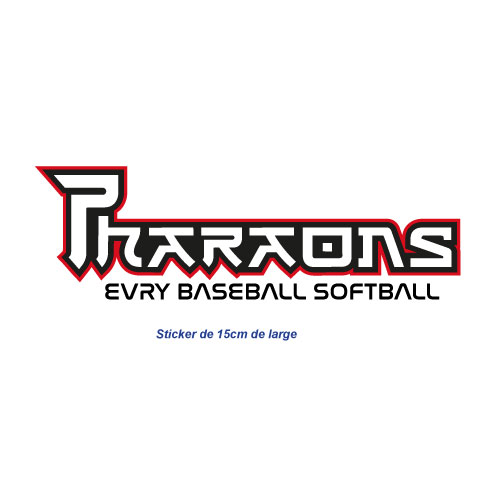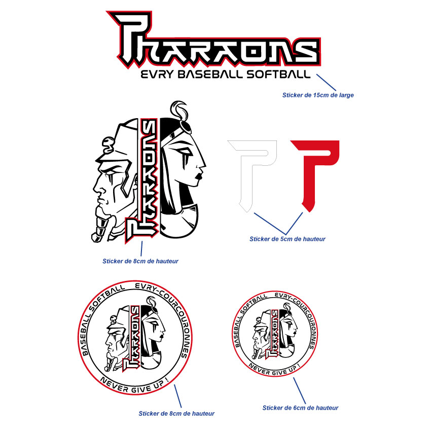 Ce visuel présente une planche A4 de stickers “Pharaons” déclinés en plusieurs tailles et orientations, idéale pour renforcer l’identité d’un club sportif. Le logo noir et blanc, cerclé d’un liseré rouge, se distingue par une typographie angulaire et puissante, lisible en grand comme en petit format, y compris en version verticale.
